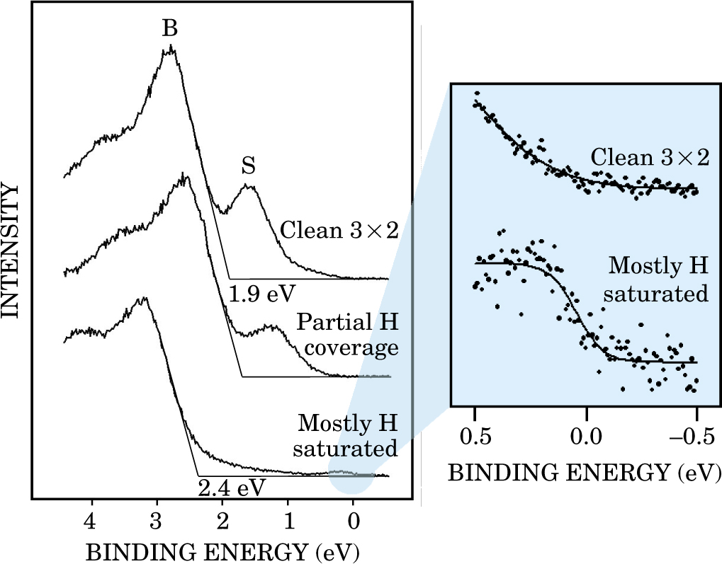Figure 2. Photoelectron spectra measure UV-induced emission of electrons located in distinct energy levels (or bands) on the first few surface layers. The gradual disappearance of the 1.6-eV band of surface states (S) with hydrogen exposure is consistent with passivation of the top-layer Si dimers as hydrogen ties up dangling bonds there. The bump at the Fermi level (enlarged in blue) is a signature for a metallic state. The concomitant shift of the valence band maximum (B) toward higher binding energies signals a shift in the surface Fermi level position up to the conduction band edge.