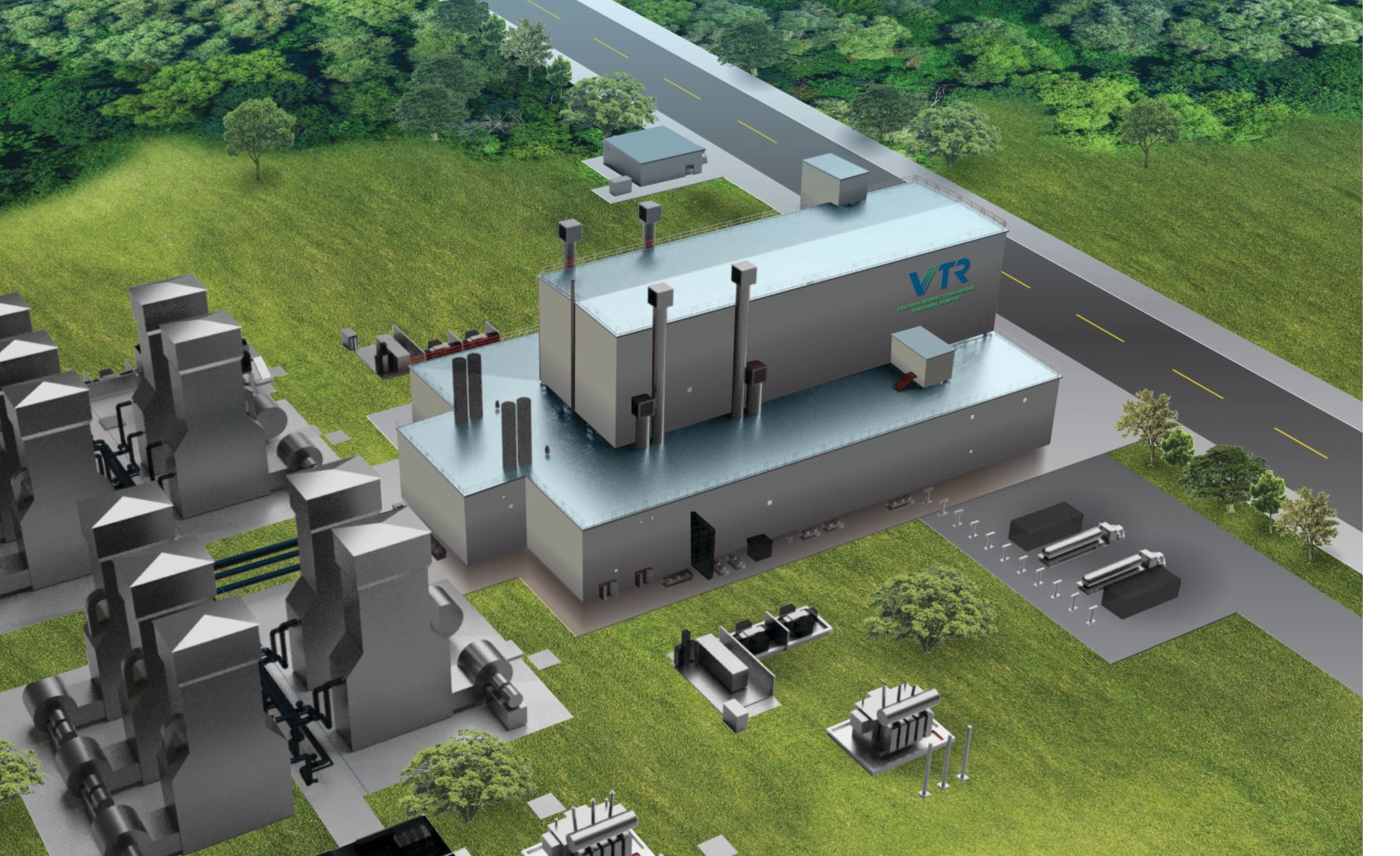 A rendering of the proposed Versatile Test Reactor shows the reactor building (with logo) and surrounding experimental hall. The structures to the left are heat exchangers that would disperse heat from the liquid sodium coolant.