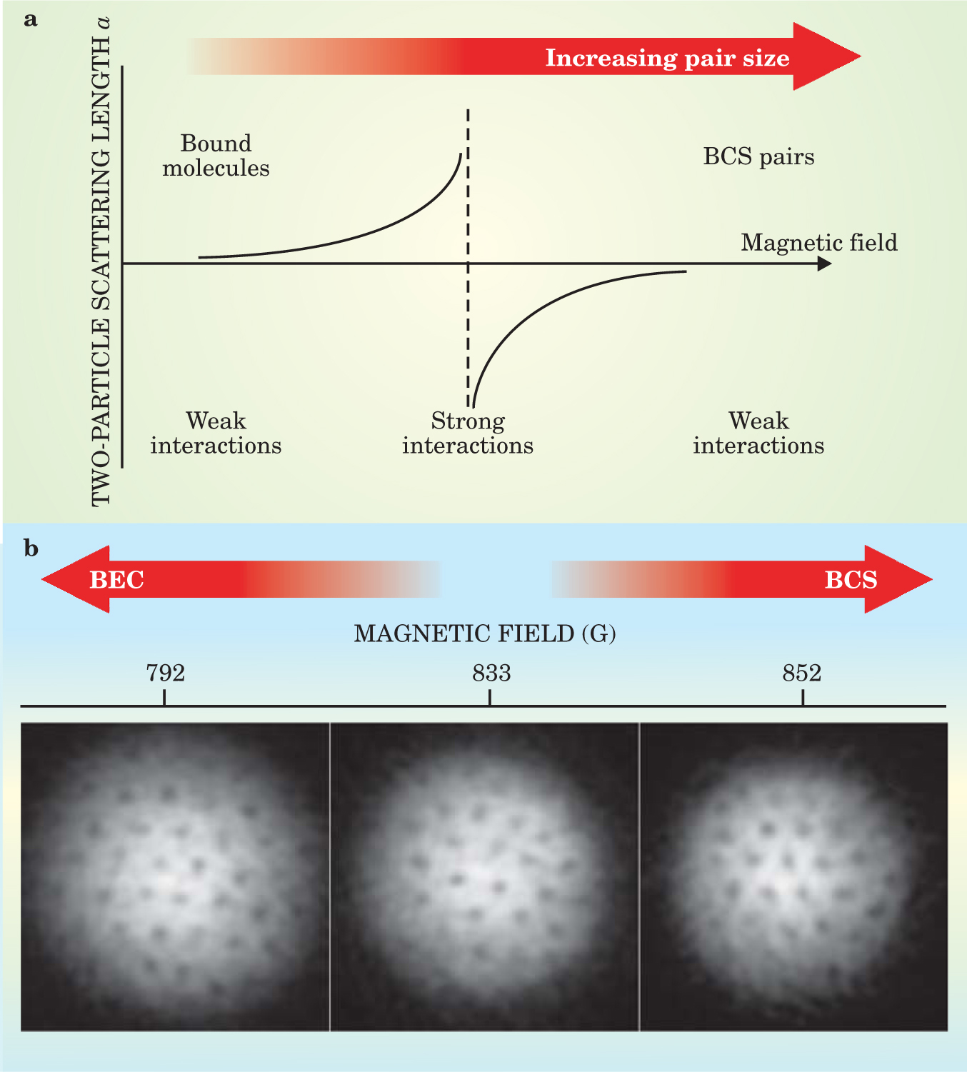 The two-particle scattering length a, which determines the strength of the interaction, depends on the magnetic field in which the fermionic atoms sit. As seen in figure 1(a), a changes rapidly when the magnetic field approaches the so-called Feshbach resonance. Far below this resonance, in the regime where molecules form, a is small and positive, which gives rise to weakly repulsive interactions between unpaired atoms. Far above resonance, on the BCS side, a is small and negative, and causes a weak attraction. Close to the Feshbach resonance region, where a goes from positive infinity to negative infinity, no simple theory applies. Theorists have predicted that the superfluidity of fermionic pairs near the Feshbach resonance should be observable at experimentally accessible temperatures.