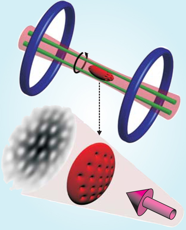 For the experiment, sketched in figure 2, the MIT team confined and cooled a gas of fermionic lithium-6 atoms in an optical trap. The gas formed a cigar-shaped cloud around a symmetry axis. Once the gas was optically trapped in a focused laser beam, the researchers applied a magnetic field parallel to the cigar’s long axis to tune the strength of the interactions. Finally, team members Martin Zwierlein, Jamil Rashid Abo-Shaeer, Andre Schirotzek, and Christian Schunck stirred the cloud by shining laser beams parallel to the same axis but on opposite sides of the condensate. The beams were moved around the periphery of the cloud at a fixed rotational frequency to add angular momentum. An additional laser beam was used to make absorption images of the vortices.