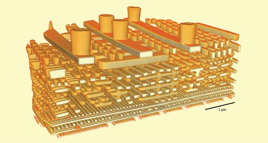 A 3D map of a microchip’s inner workings highlights the metallic interconnections and tiny transistors that make up the integrated circuit. Credit: T. Aidukas et al., Nature 632, 81 (2024)