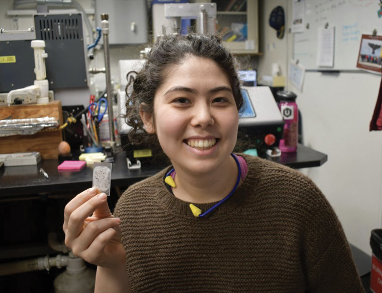 Joides Resolution technician Luan Heywood holds a rock that was deposited by a long-ago melted Antarctic iceberg. The sample is about 30 microns thick.