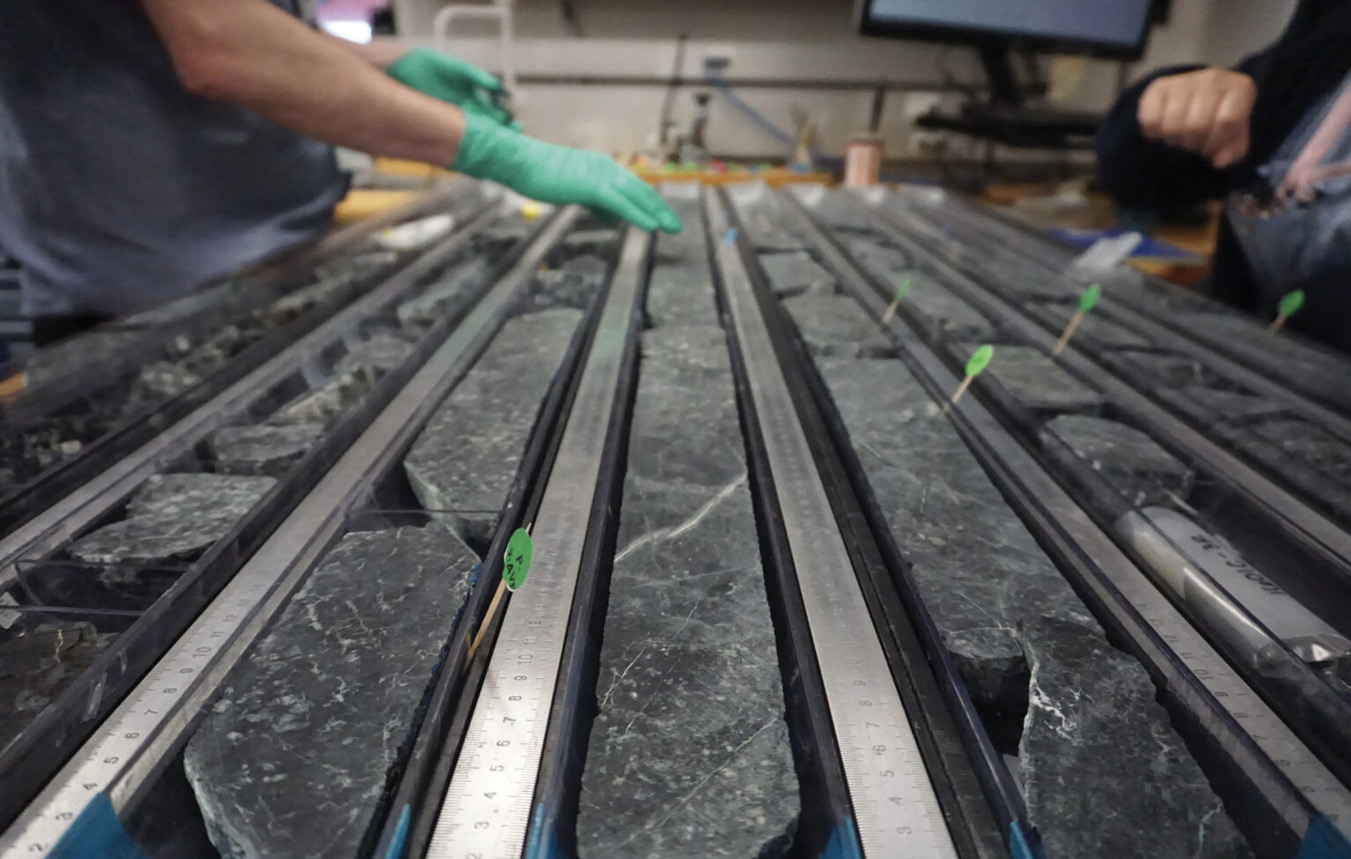 Researchers examine a sample of mantle rock that was pulled up from more than a kilometer below the ocean floor.
