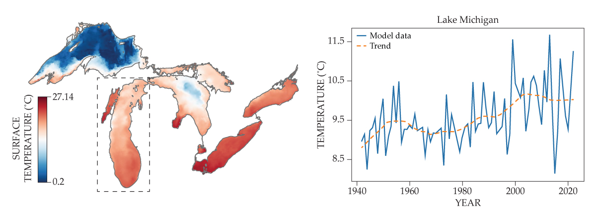A snapshot of lake surface temperatures from 18 July 2018 (left) from the hydrodynamic–ice model used by researchers to reconstruct the past eight decades of Great Lakes water temperatures. A graph of the average lake surface temperatures for Lake Michigan over the past 80 years (right) shows both extreme events and a longer-period trend. (Figure adapted from H. U. Abdelhady et al., Commun. Earth Environ. 6, 375, 2025
