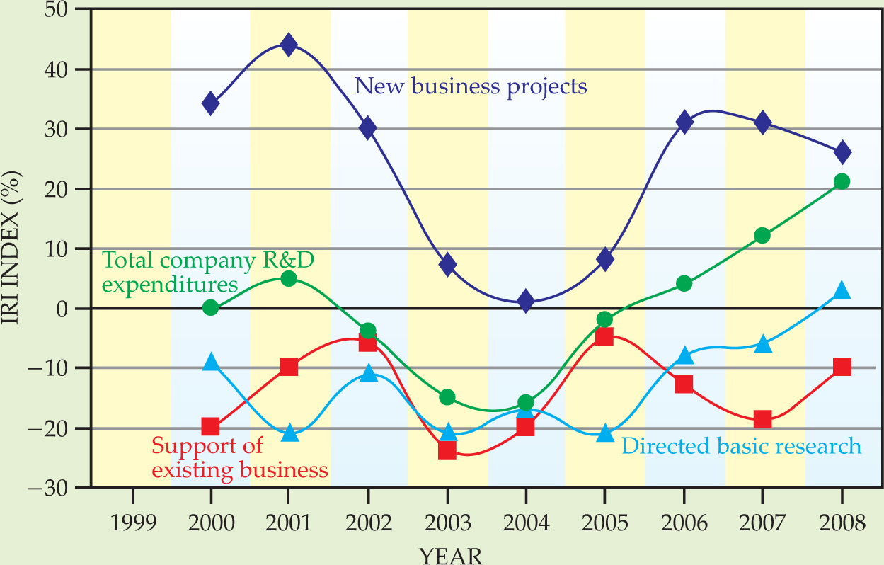 James Scinta, a manager at member company ConocoPhillips Co and author of the IRI survey report, says it is surprising to see companies continue to invest in R&D given mixed market signals related to the mortgage crisis, energy prices, and the weak dollar. Results are shown in the figure and