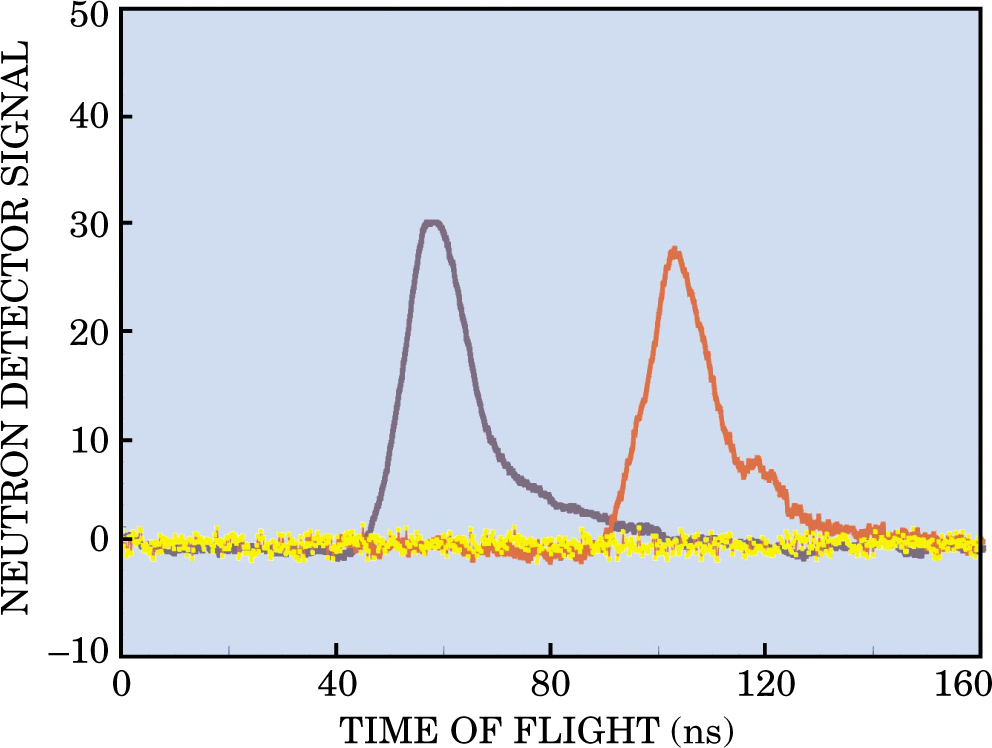 Figure 3. Time delay between neutron signals seen by two counters—one (red) 98 cm farther from the imploding deuterium capsule than the other (blue)—yields a neutron kinetic energy of 2.46 ± 0.15 MeV, as one would expect for thermonuclear fusion in deuterium. The yellow trace was recorded for shots in which a small admixture of xenon kept the ion temperature too low for thermonuclear fusion.