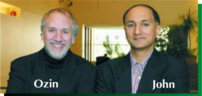 The collaboration began when John approached Ozin. “I hadn’t heard of him,” says Ozin. “He started talking about photonic crystals, and I hadn’t heard of them either. He showed me incredible structures, and I thought, ‘My God, they are materials filled with holes.’ “ Ozin, who had “always worked with materials riddled with periodic arrays of holes,” scaled up from the nanometer to micron scale. In working together, he says, “there has to be trust, respect, friendship, collegiality. It’s just like a marriage.”