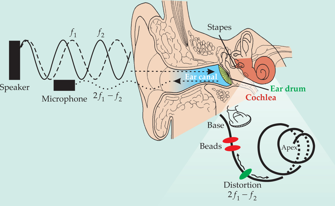 In 1978 biophysicist David Kemp made a remarkable discovery. 2 The cochleae in live animals not only process external sounds but also create their own, which leak back out through the stapes and eardrum. Those otoacoustic emissions are a normal byproduct of the ear’s amplification process and distinguish a healthy cochlea from an impaired one. Detecting OAEs in the lab is as simple as listening for spontaneous tones, echoes, or distortions that emerge from the ear, sometimes in response to certain frequencies. Distortion, for example, refers to the nonlinear response of the cochlea to the mixing of different-frequency sounds introduced to the ear. Today clinical OAE measurements are a routine part of audiometric tests, and our ability to disentangle the emitted frequency components makes them powerful diagnostics. Indeed, nearly every infant born in the US is tested for OAEs.
