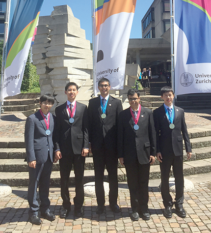The US team took home two gold and three silver medals this year. The competitors were, from left, Vincent Liu, Jimmy Qin, Abijith Krishnan, Srijon Mukherjee, and Jason Lu.