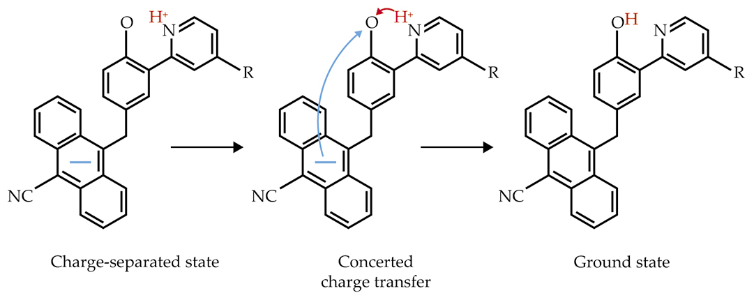 In their new paper, Mayer and colleagues also looked at intramolecular charge transfer, this time in a family of three-part molecules called anthracene-phenol-pyridines.