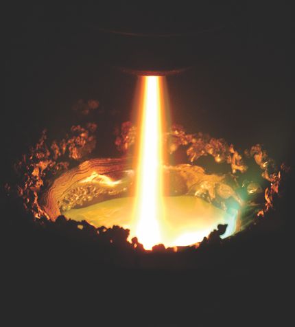 The plasma torch in the Retech plasma furnace is one tool used in the materials preparation center at the Ames Laboratory to create ultrapure metal alloy samples, particularly of rare-earth metals.