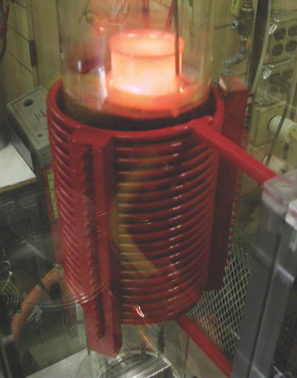 A vacuum induction furnace at Ames Lab being used to distill a rare-earth metal. The red induction coil surrounds a quartz vacuum tube. The glowing cylinder at the top is the condenser, which collects the metal.