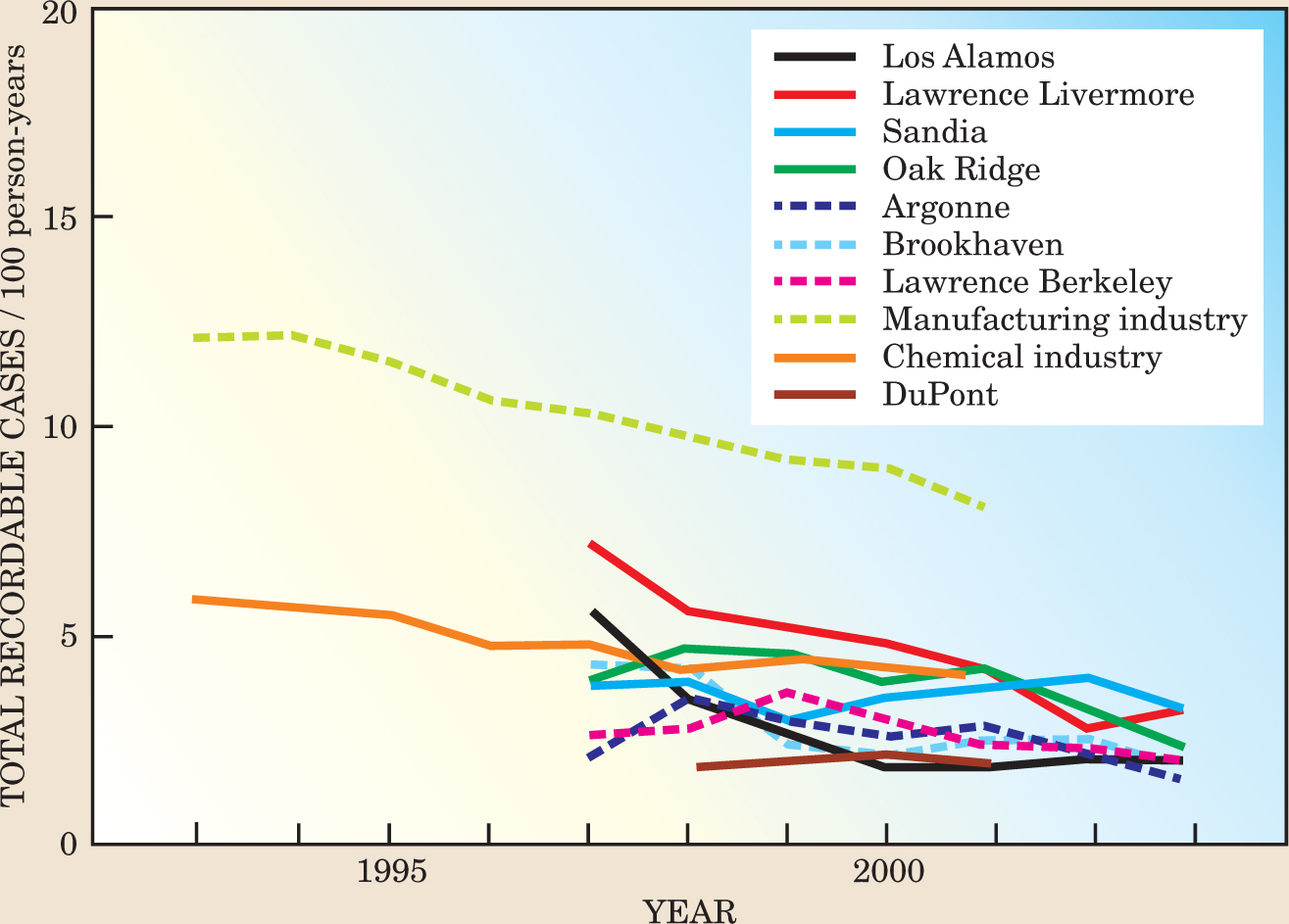 The accompanying figure shows timelines of recordable safety incidents (injury and illness) over the past decade, normalized to the equivalent of 100 person-years worked, for DOE labs (LANL, LLNL, SNL, Oak Ridge, Argonne, Brookhaven, and Lawrence Berkeley), and the nationwide averages for the manufacturing and chemical industries, along with the figures for the DuPont company, an acknowledged leader in industrial safety.