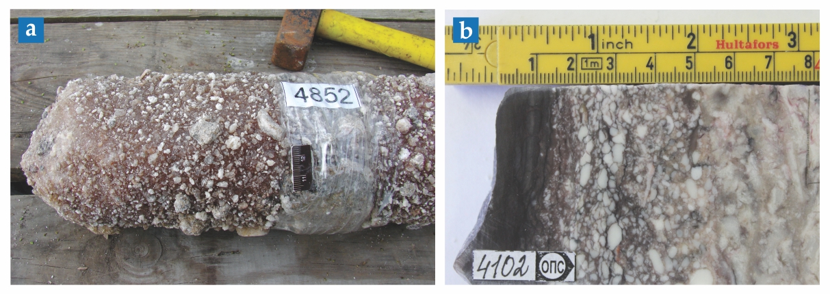 Ancient salt samples with different compositions. The deeper specimen (a), produced from highly concentrated seawater, contains sodium chloride, calcium sulfate, magnesium sulfate, and other minerals. The shallower specimen (b), produced when the seawater was less concentrated, is mostly CaSO4 and magnesium carbonate. The absence of NaCl in the second sample means that the seawater’s Ca2+ and concentrations were high enough that CaSO4 precipitated before NaCl.