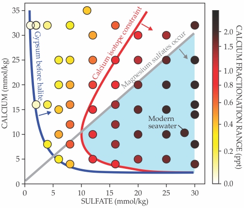 Figure 3 shows how those measurements relate to the ancient seawater composition. The colored dots show the range of δ44/40Ca values theoretically derived for various concentrations of calcium and sulfate. The isotope measurement establishes a minimum sulfate concentration that’s considerably higher than can be obtained from the salts’ chemical compositions alone.