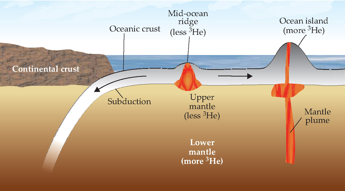 Figure 1. As oceanic crustal plates pull apart at the mid-ocean ridges, upper-mantle material melts and wells up to create new crust. The old crust subducts, or sinks beneath a neighboring plate back into the mantle. Ocean islands, in contrast to the ridges, form from molten plumes originating deep within the mantle. In each process, the molten mantle gives up some of its helium, including primordial 3He that is never replaced. The upper mantle is thought to be more processed and more degassed than the lower mantle, so the mid-ocean ridges contain less 3He than the ocean islands.
