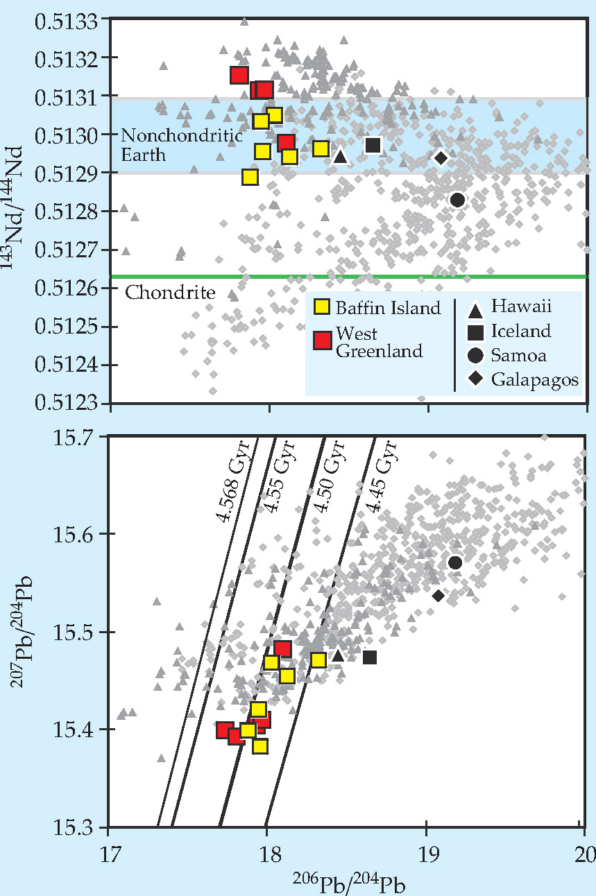 Figure 2. Isotopic measurements of Baffin Island (yellow), neighboring West Greenland (red), other especially helium-3-rich ocean islands (black), and other terrestrial samples (gray). As the top panel shows, the neodymium compositions of the Baffin samples fall within the range (blue stripe) expected of primitive material in a nonchondritic Earth. As the bottom panel shows, their lead isotopic compositions cluster around the 4.50-billion-year isochron, as expected of a mantle reservoir that’s been isolated since early in Earth’s history.