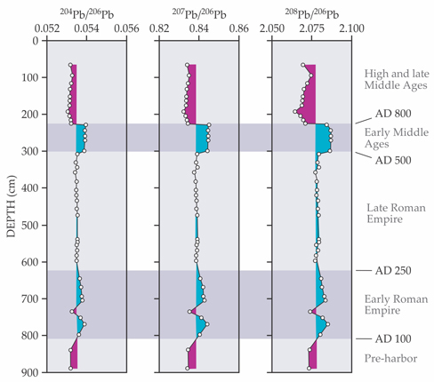 Albarède and colleagues excavated two cores from different parts of the Portus harbor; the first 700–800 cm of each consisted of sediment deposited in the harbor over the past two millennia. Using carbon-14 dating of organic matter in the cores, they established the relationship between depth and age, accurate to within 100 years. Then they measured the Pb isotope ratios as a function of depth. As shown in the figure for one core, those ratios rose and fell in concert.