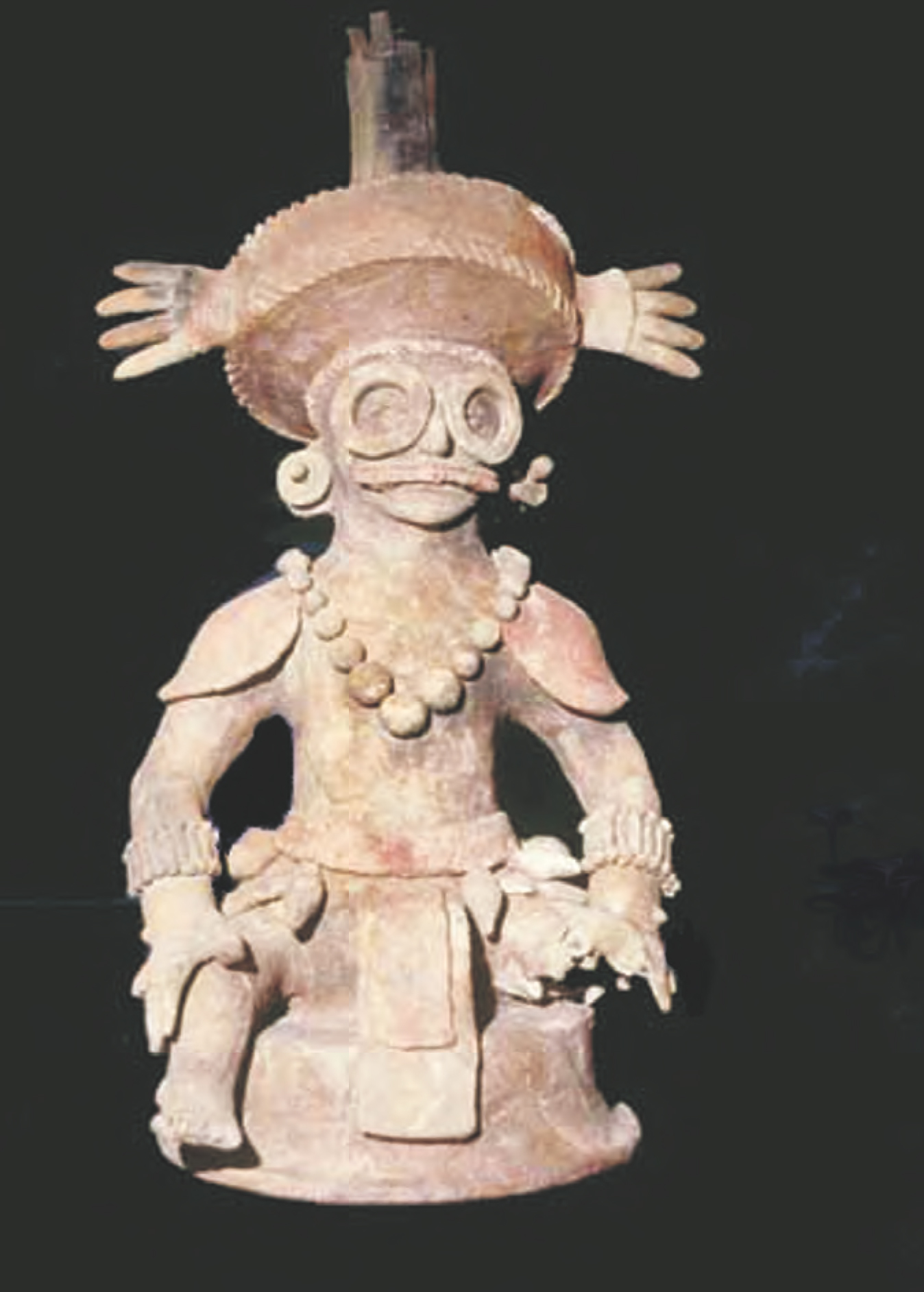 This ceramic figurine of Yax K’uk Mo shows the king wearing goggles characteristic of Teotihuacán. The figurine, which is about 70 cm tall, dates from 695 AD, 269 years after Yax K’uk Mo’s coronation.