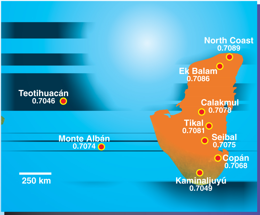 Ratios of strontium-87 to strontium-86 for various pre-Columbian cities in Mesoamerica. The Maya world is shown in red. At 0.7084, the value of 87Sr/86Sr in enamel taken from one of Yax K’uk Mo’s molars is slightly higher than the local value at Tikal.
