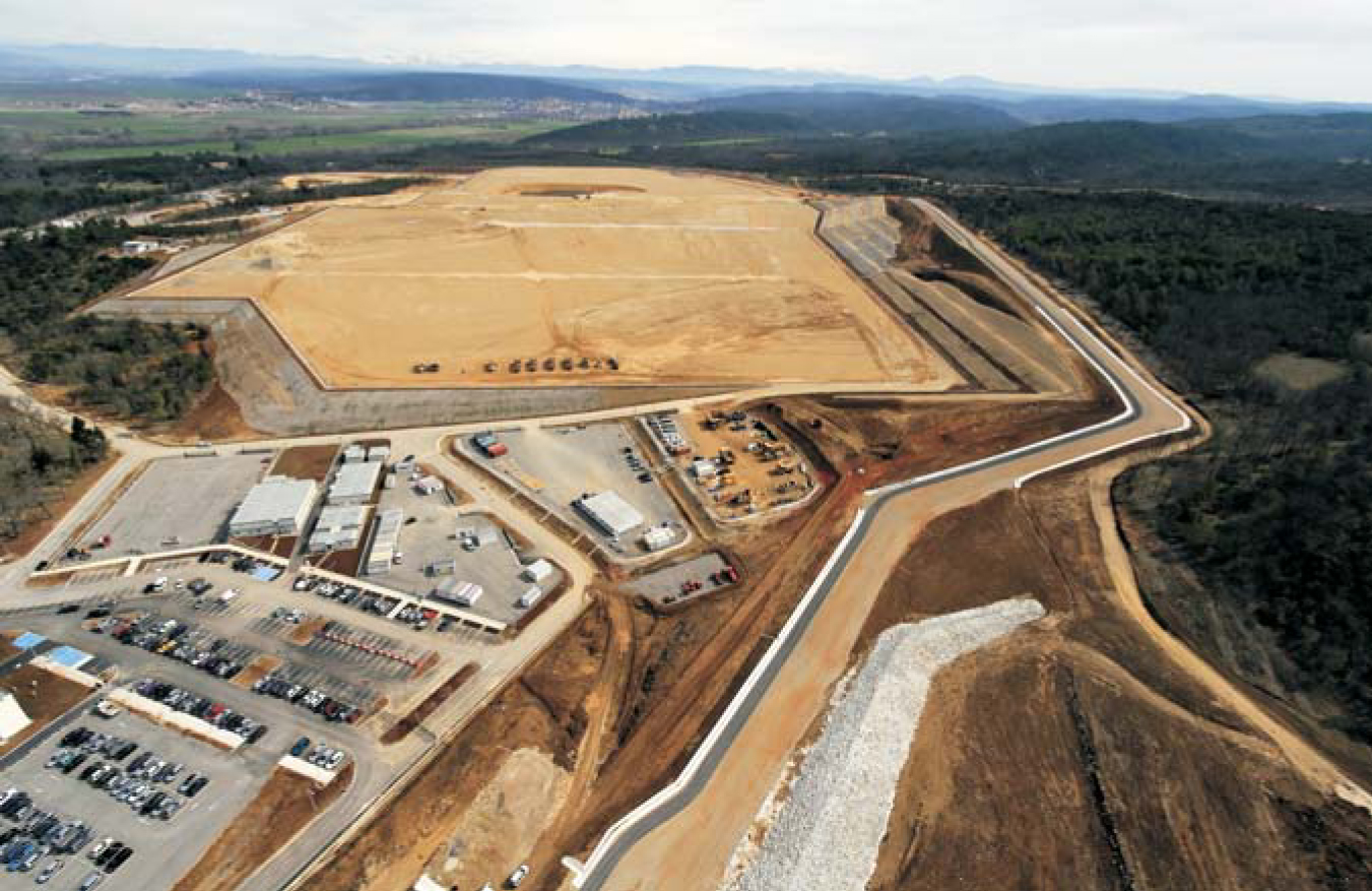 Aerial view of the ITER site in Cadarache, France. The tokamak will go in the pit at the far end of the razed area.