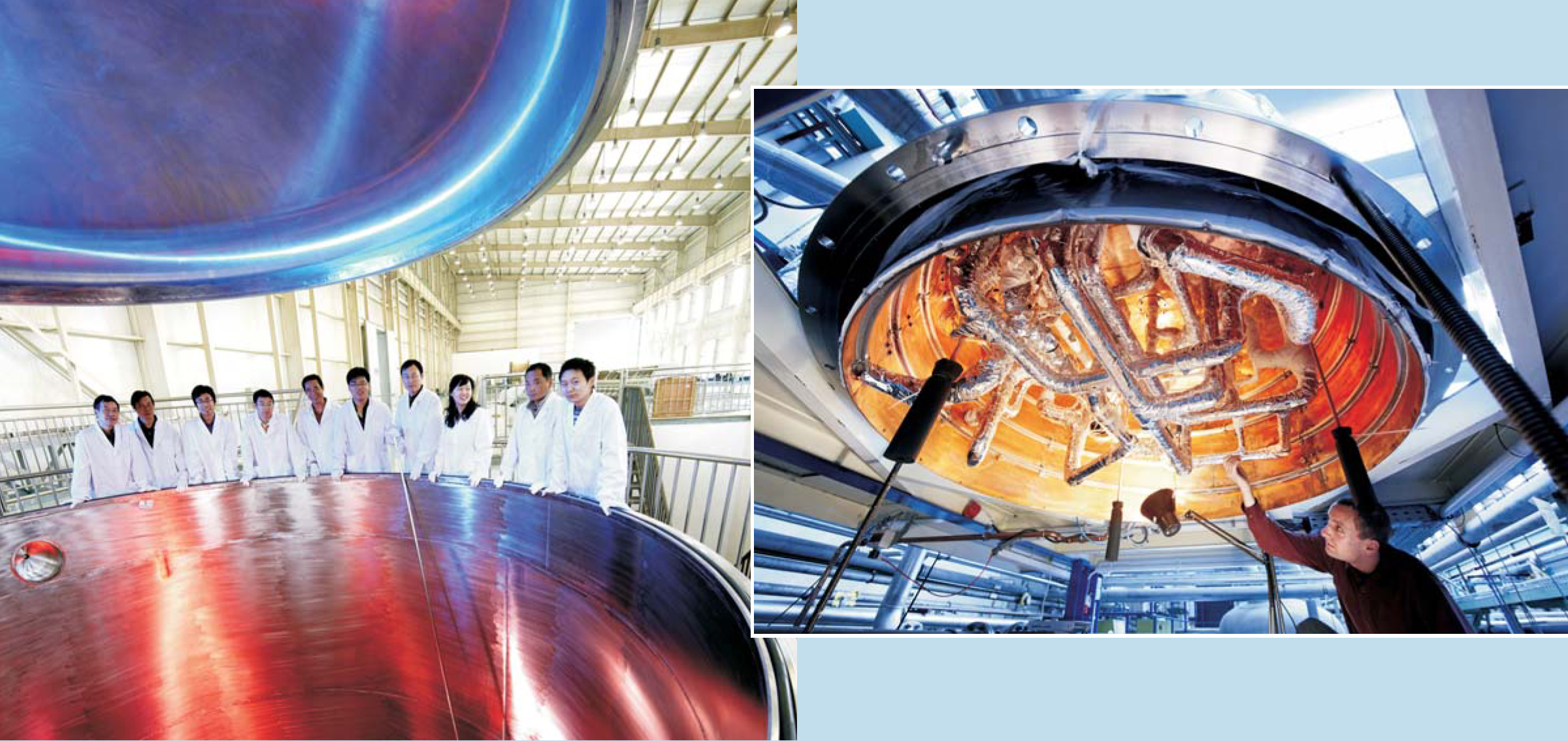 Research and development on ITER components is well under way, despite on-site construction having yet to begin. A team at the Institute of Plasma Physics in Hefei, China, is working on a vacuum chamber (left) that will test for leaks in superconducting coils. The photo at right shows a cryogenic system for ITER vacuum pumps, which is being built at Karlsruhe Institute of Technology in Germany.