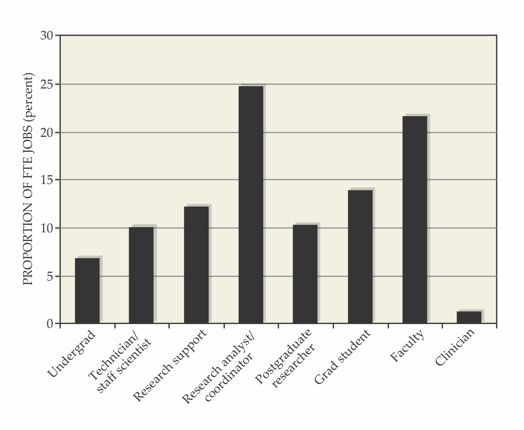 Only around one-fifth of the full-time equivalent (FTE) jobs traceable to most federally sponsored basic research were faculty positions, according to data from 55 large research universities that participate in the Star Metrics data-gathering system.