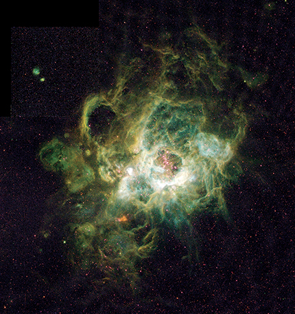 NGC 604, a vast star-forming region in a spiral galaxy 2.7 million light-years away in the constellation Triangulum, as imaged by the Hubble Space Telescope. The hot plasma fluoresces and highlights the nebula’s shape. (Image courtesy of Hui Yang [University of Illinois] and NASA.)