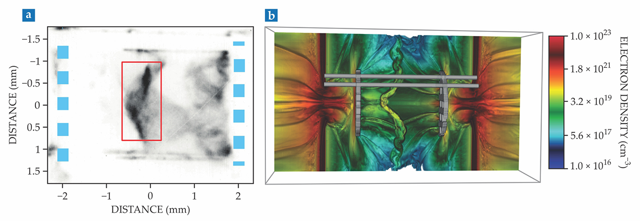 X-ray images showed (a) that the colliding plasma jets reached the turbulent regime after they were created by laser pulses and passed through a grid of holes (blue squares). (b) Numerical simulations verify that x-ray images capture the electron density fluctuations expected in a turbulent plasma. Deep red vertical bars represent the irradiated foils; vertical gray disks are the grids through which the plasma flows. The horizontal gray bars form part of the frame that holds the foils 8 mm apart. (Adapted from ref.