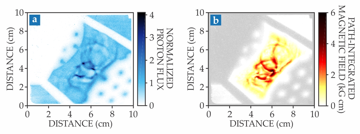 In one method, the researchers measured the polarization of light passing through the plasma. They based their approach on a technique astronomers use to measure the magnetic fields of distant objects. In the other method, they imaged protons fired through the plasma (figure