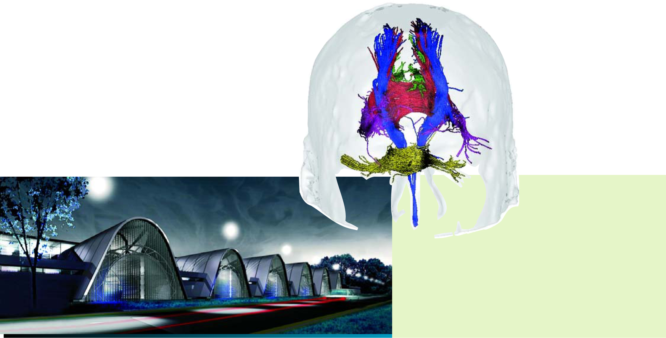 Modeling the brain will be the focus at NeuroSpin (left), an interdisciplinary lab being built in Saint Aubin, 40 km southwest of Paris. The facility’s strong magnetic fields will, for example, yield finer detail in in-vivo visualizations of the brain’s white matter (shown in false color, above) with diffusion magnetic resonance imaging.