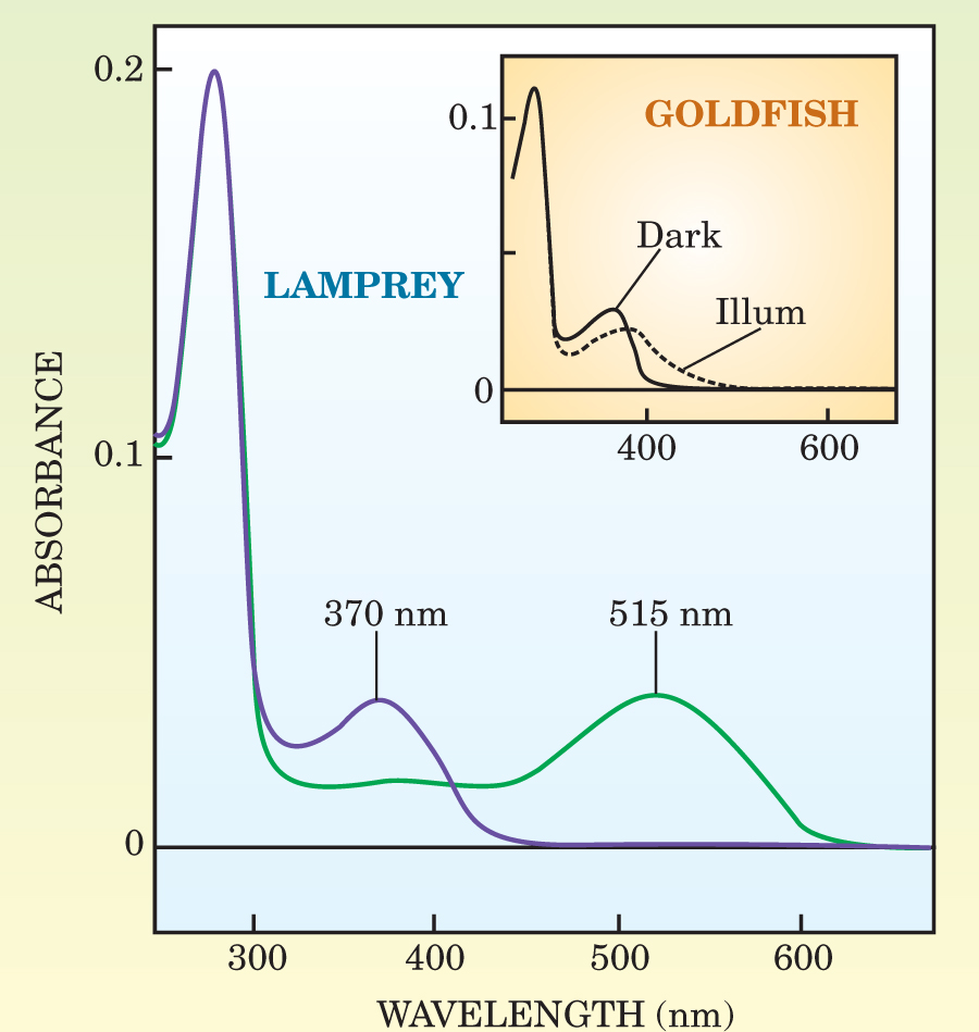 He and his coworkers isolated the genetic sequence of the goldfish UV opsin and reconstituted the corresponding photoreceptors, just as they had for the lamprey’s UV photoreceptor. Subjecting the goldfish photoreceptors to the same spectroscopic tests revealed a different response to UV light. The goldfish’s absorbance, like the lamprey’s, exhibits a maximum in the UV. But after exposure to UV light, no amount of light at any wavelength can restore the UV-absorbing state.