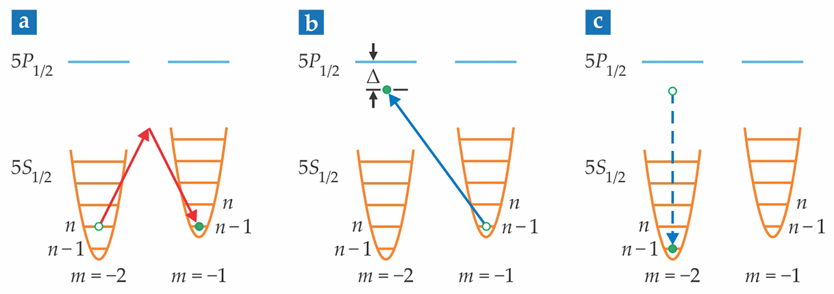 Then, when an atom with n vibrational quanta in the m = −2 state is transferred to the degenerate m = −1 state, it arrives with n − 1 vibrational quanta; that step, driven by a two-photon interaction with the trapping light, is known as a Raman transition. A shorter-wavelength pump beam then transfers the atom to an excited state with m = −2. When the atom decays to the electronic ground state, it does so with n − 1 vibrational quanta.
