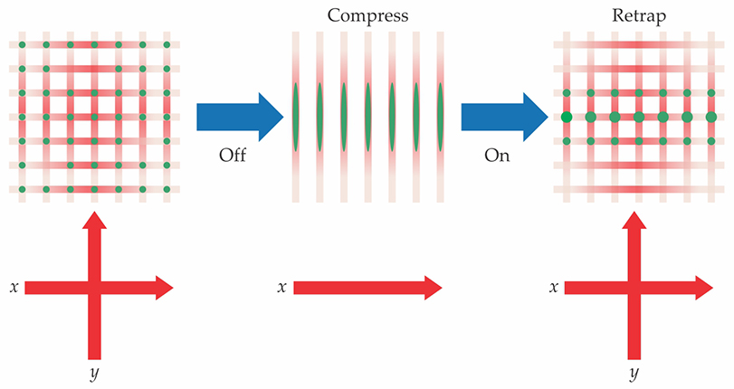 Release and retrap. A gas of atoms (green) trapped in a two-dimensional optical lattice (red) can be compressed by briefly turning off one of the trapping beams. Here, when the y beam is turned off, atoms are driven by intensity gradients toward the axis of the x beam. If the y beam is restored at just the right moment, the gas of atoms is retrapped in a smaller region of the optical lattice. The process can then be repeated with the x beam. (Adapted from ref.