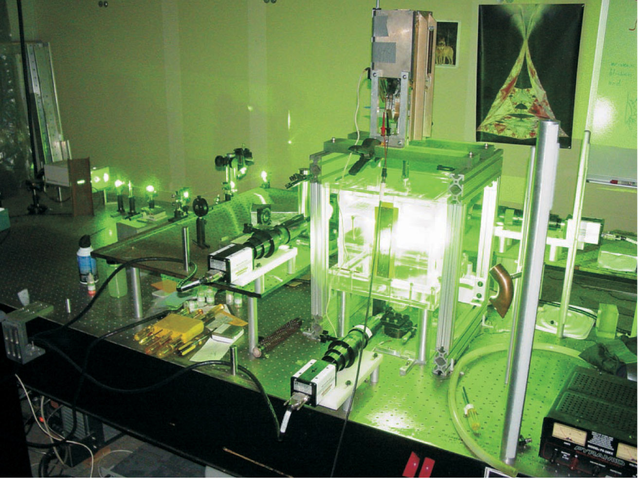 To form the faces of the cube, the beams pass through cylindrical lenses that focus the beam into sheets about 2 mm long and 10 µm thick (see the figure above). Aligning the sheets to intersect proved to be the experiment’s hardest task. Zeff did it by looking at the sheets with the same cameras that imaged the flow. He then repositioned the beams with micrometers.