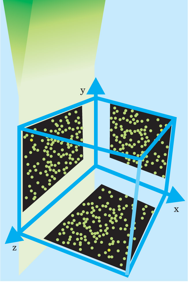 To create such an illumination pattern, Zeff and Lathrop sought the help of their Maryland colleague and laser expert Raj Roy and his graduate student Ryan McAllister. In the system they built, light from a single continuous-wave laser is split into three mutually orthogonal beams that converge in the center of the tank. One beam points vertically through the bottom of the tank; the other two point horizontally.