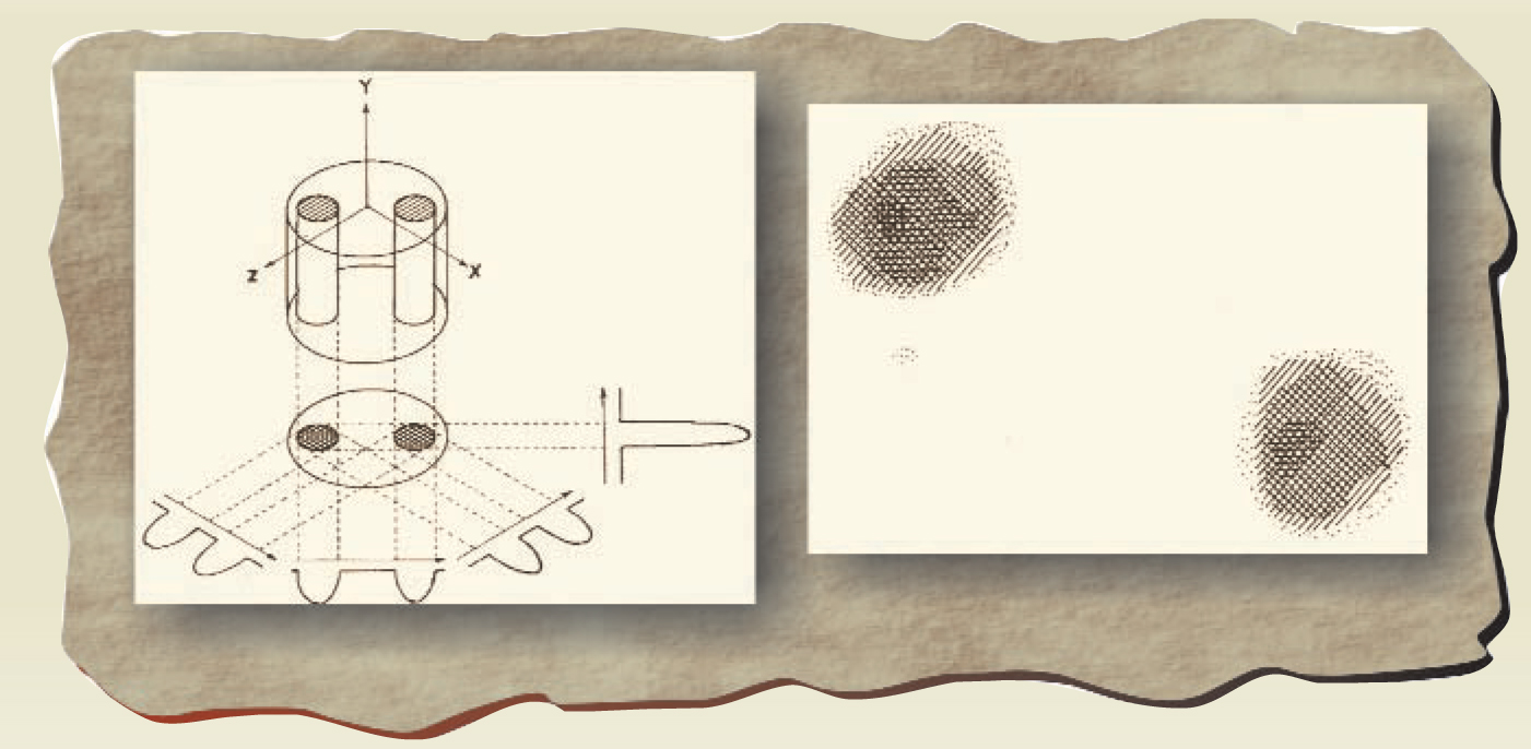 Figure 1. The first magnetic resonance image, published by Paul Lauterbur in 1973, was a cross section of two 1 -mm-diameter tubes of water in an NMR spectrometer. The curves in the left panel show the dependence of the NMR signal on the variable strength of the instrument’s uniform magnetic field (at constant radio frequency) when small linear field gradients are added in four different directions. They are, in effect, projections of the sample’s spatial distribution of hydrogen nuclei. Combining the four projections by a geometric algorithm yielded the two-dimensional image in the right panel.