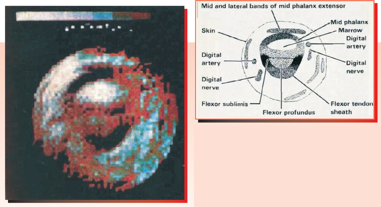 Figure 2. The finger of Andrew Maudsley, Peter Mansfield’s student in 1976, provided the first human in-vivo MRI image. The color coding indicates the intensity of different pixels. The labeled tracing of the cross-sectional image shows the impressive anatomical detail already revealed by MRI in those early days.