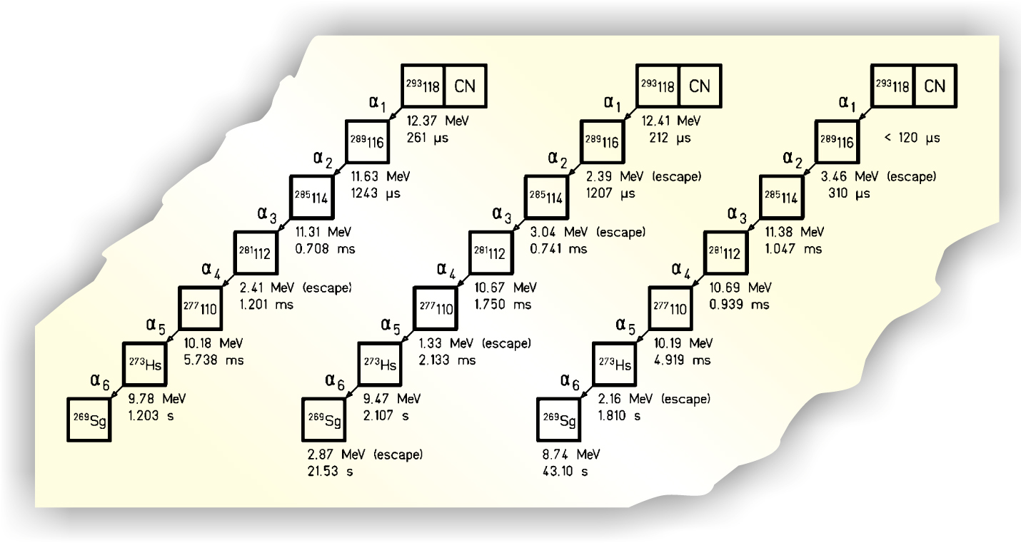 The Berkeley team’s 1999 paper claimed to have found three atoms of element 118 in 10 days of running. The reported evidence, reproduced in figure 2, was the observation of 17 of the 18 alphas from the three decay chains from 293118 down to 269106 (seaborgium).