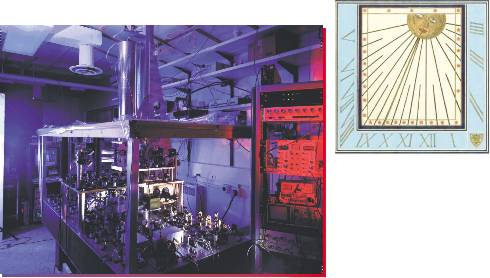 Sundials are the only clocks that mark time directly from Earth’s rotation around the Sun. The cesium fountain standard atomic clock (left) at NIST in Boulder, Colorado, keeps time to about one second in 30 million years. It is one of several clocks worldwide used by the Bureau International des Poids et Mesures to monitor international atomic time. (Sundial image used with permission of the Master and Fellows of Gonville and Caius College, Cambridge, UK.)