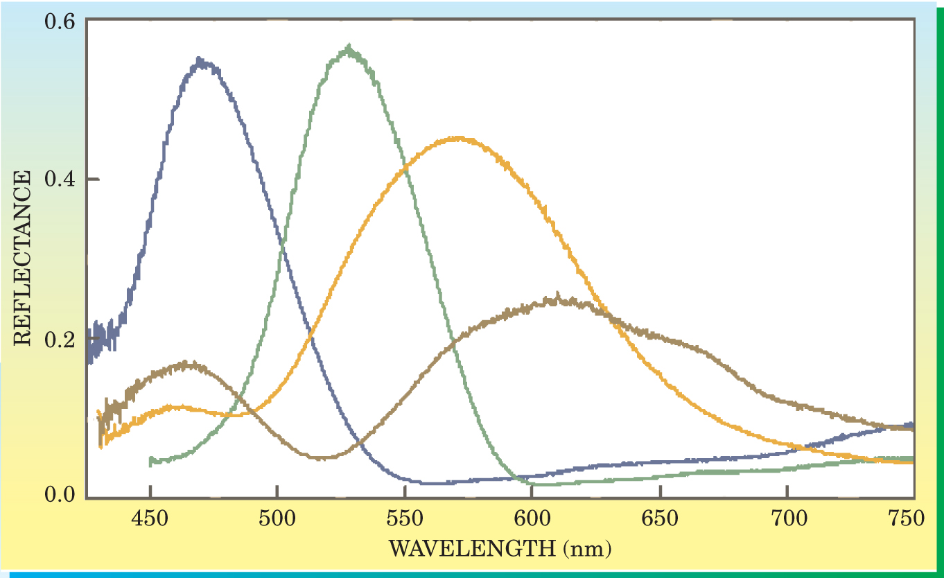 Reflectance of light off peacock feather barbules is determined by internal periodic structures. This graph shows the reflectance of light normally incident on barbules taken from four differently colored regions of a peacock tail feather.