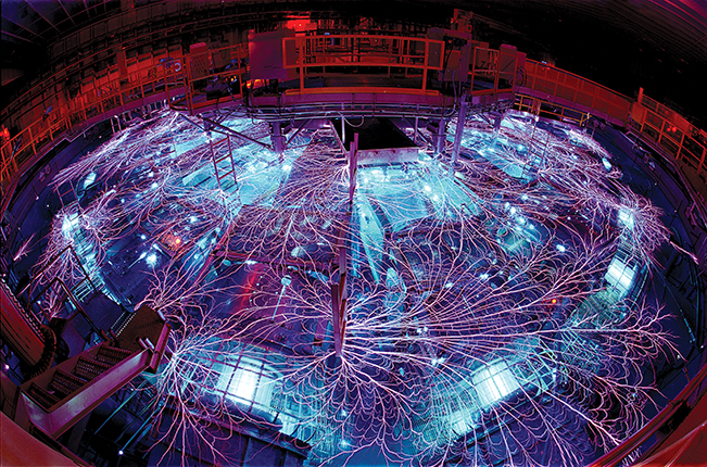Figure 1. To squeeze liquid deuterium into its metallic phase, researchers discharged the 2160 capacitors of Sandia National Laboratories’ Z machine and sent a precisely shaped 1-μs current pulse that delivered 2 MJ of energy to a target at the machine’s center. The power transmission cables, as big around as small cars, are submerged in oil or deionized water, which serves as an insulator. Electrical arcs that play over the device during discharge, shown here, make for a dazzling display. (Photo by Randy Montoya/Sandia National Laboratories.)