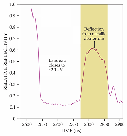 Figure 2 shows the reflectivity of the sample relative to the reflectivity of aluminum, which was measured separately during the experiment. The Z machine’s current pulse reaches the target roughly 1800 ns after the capacitors discharge. For times up to 2600 ns, the reflectivity ratio is essentially 1, which indicates that the deuterium was in its transparent, insulating molecular state and that reflection occurred at the interface between the sample and the cryocell’s aluminum front face.