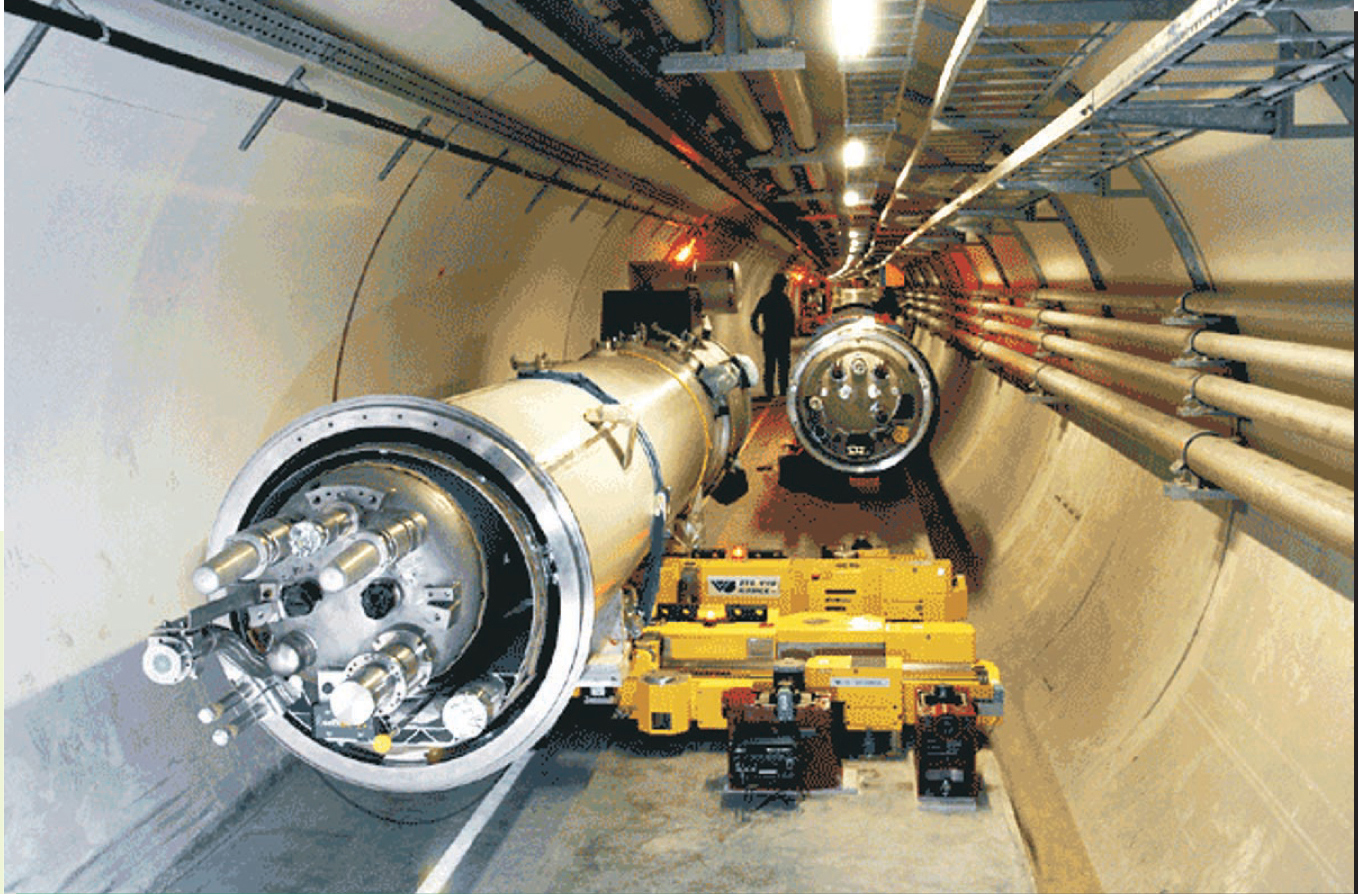 Figure 1. A Cryomagnet that will operate at CERN’s Large Hadron Collider was positioned on its jacks during a test conducted last January. Scheduled to be producing physics results before the end of the decade, the LHC will be by far the world’s highest-energy particle accelerator.
