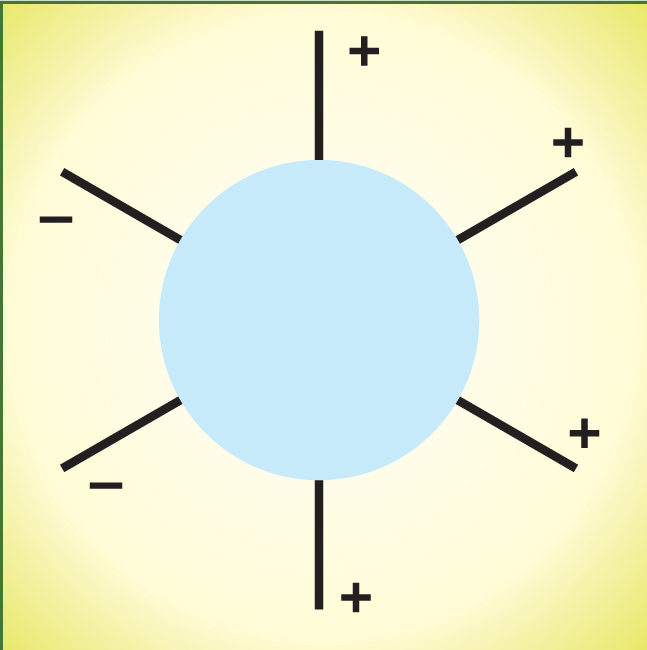 Figure 2. A generic Feynman diagram with six external lines symbolizes the production of four jets. Two of the lines represent the incoming colliding particles, and four represent the outgoing particles that generate the jets. In a tree-level diagram, the shaded region would contain a specific set of interaction vertices and internal straight lines called propagators. The plus and minus signs denote helicities.