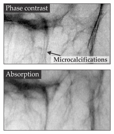 Small, treatable tumors are difficult to spot in mammograms because healthy and cancerous tissues differ little in how they absorb x rays. But absorption isn’t the only source of contrast. As x rays pass through an inhomogeneous medium, they can acquire differences in phase—even if the medium is a uniform absorber. Early attempts at phase-contrast imaging required a synchrotron or other bright, coherent source of x rays. Now Alessandro Olivo of University College London and his collaborators have built a prototype machine that performs phase-contrast mammography with a conventional x-ray tube at clinically acceptable doses. The setup works by masking the x-ray source with an array of hundreds of narrow, closely spaced holes. Each beam that emerges points at a single pixel of a flat-panel detector. The detector is also masked—such that half the x rays from each beam are prevented from reaching their designated pixel. When an object is placed between the source and the detector, the beams suffer either absorption or, thanks to a change in phase, refraction. Because of the setup’s geometry and the small angles of refraction involved, some refracted photons will still reach their pixel, but others will miss and hit the mask. Enough photons are diverted to the mask that they boost the contrast of what would otherwise be a conventional absorption image. Olivo’s team tested its setup on donated samples of cancerous breast tissue. Microcalcifications that presage cancer showed up more clearly in the phase-contrast image than in an absorption image. (A. Olivo et al., Med. Phys. 40, 090701, 2013.)