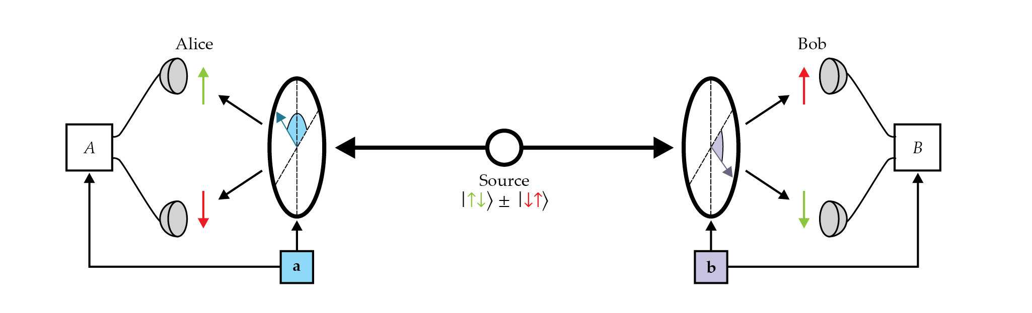 John Bell’s famous inequality was derived for the setup illustrated here. A pair of spin-½ particles are prepared in a state of zero angular momentum, and each propagates freely in opposite directions to the measuring stations called Alice and Bob. Alice measures the spin in a direction a while Bob simultaneously measures in a direction b. In a hidden-variable theory, the measurement results are predetermined; the hidden variables might decree, for example, that if Alice measures her spin up, Bob will measure his down. (Adapted from R. A. Bertlmann, J. Phys. A 47, 424007, 2014