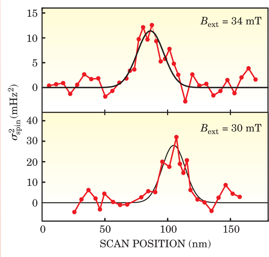 That syncopation introduces a weak, square-wave signal of frequency shift into the stream of data from the interferometer. Careful data analysis teases out the signal, but only after considerable signal averaging. To detect a single electron spin, the IBM team operated its cantilever for 13 hours. Figure 2 shows the result: a 5-standard-deviation signal that localizes the spin to 25 nm.