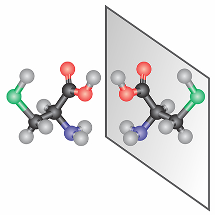 The amino acid cysteine, like most other biomolecules, is structurally distinct from its mirror image. The molecular form on the left is the one found in living things.