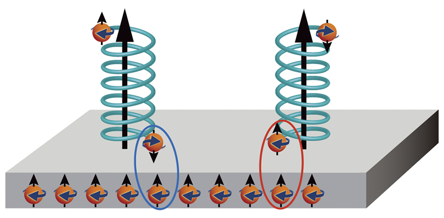 As mirror-image molecules (light blue spirals) approach a magnetized substrate, they temporarily take on equal and opposite spin distributions induced by the internal flow of electrons. When the molecular spin nearest the surface is antiparallel to the substrate spins, as shown in the blue oval, the molecule easily adsorbs. When the spins are parallel (red oval), adsorption is inhibited by the Pauli exclusion principle. (Adapted from ref. 2.)